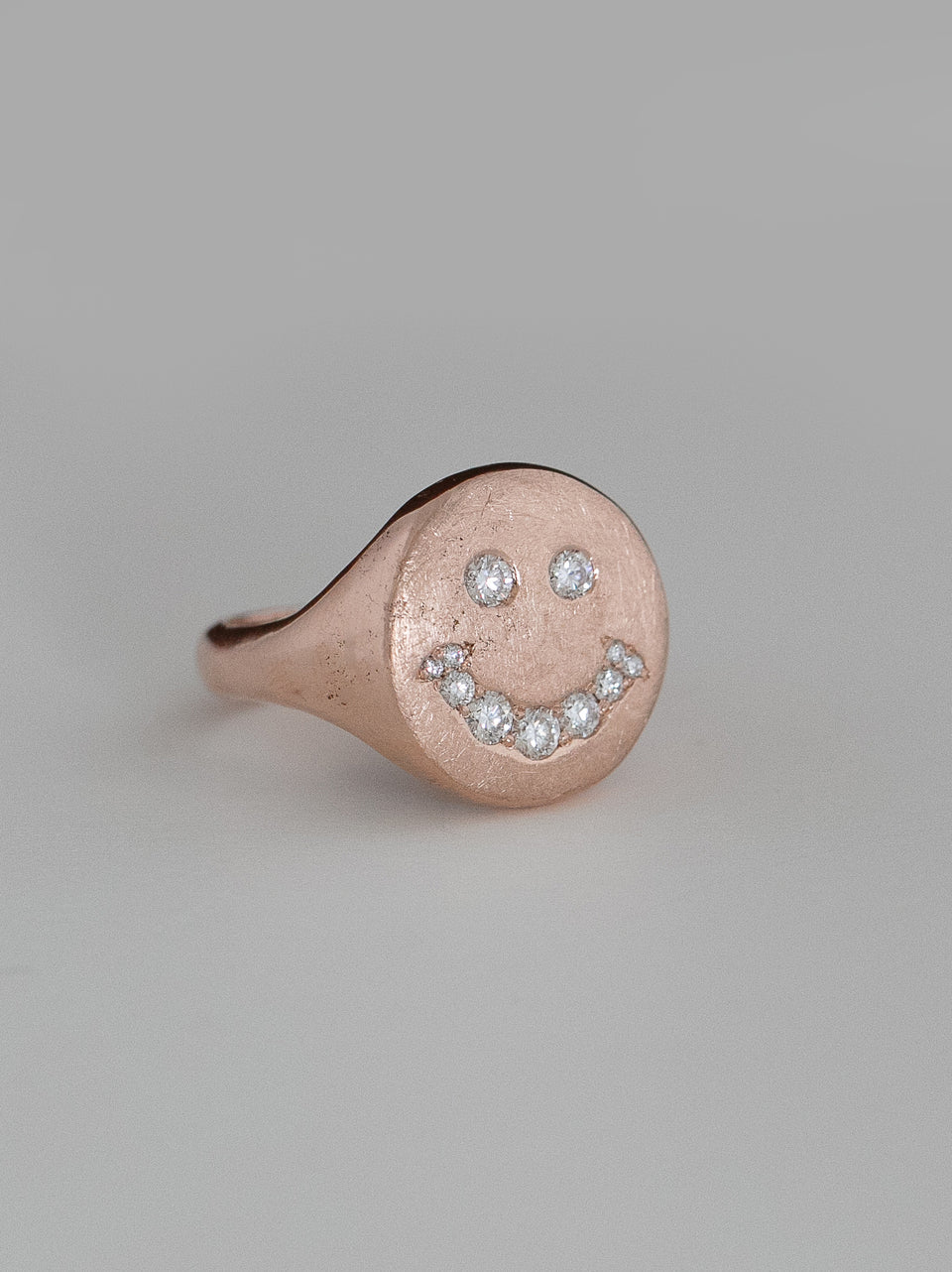 This rose gold ring is a luminous reimagining of resilience and renewal. Diamonds once set in an engagement ring — symbols of a closed chapter — are reborn here as an emblem of joy. The smile, traced in repurposed stones, holds both tenderness and lightness, a reminder that love never truly disappears. Even after loss, it remains — waiting to be reshaped into something that carries hope forward.
