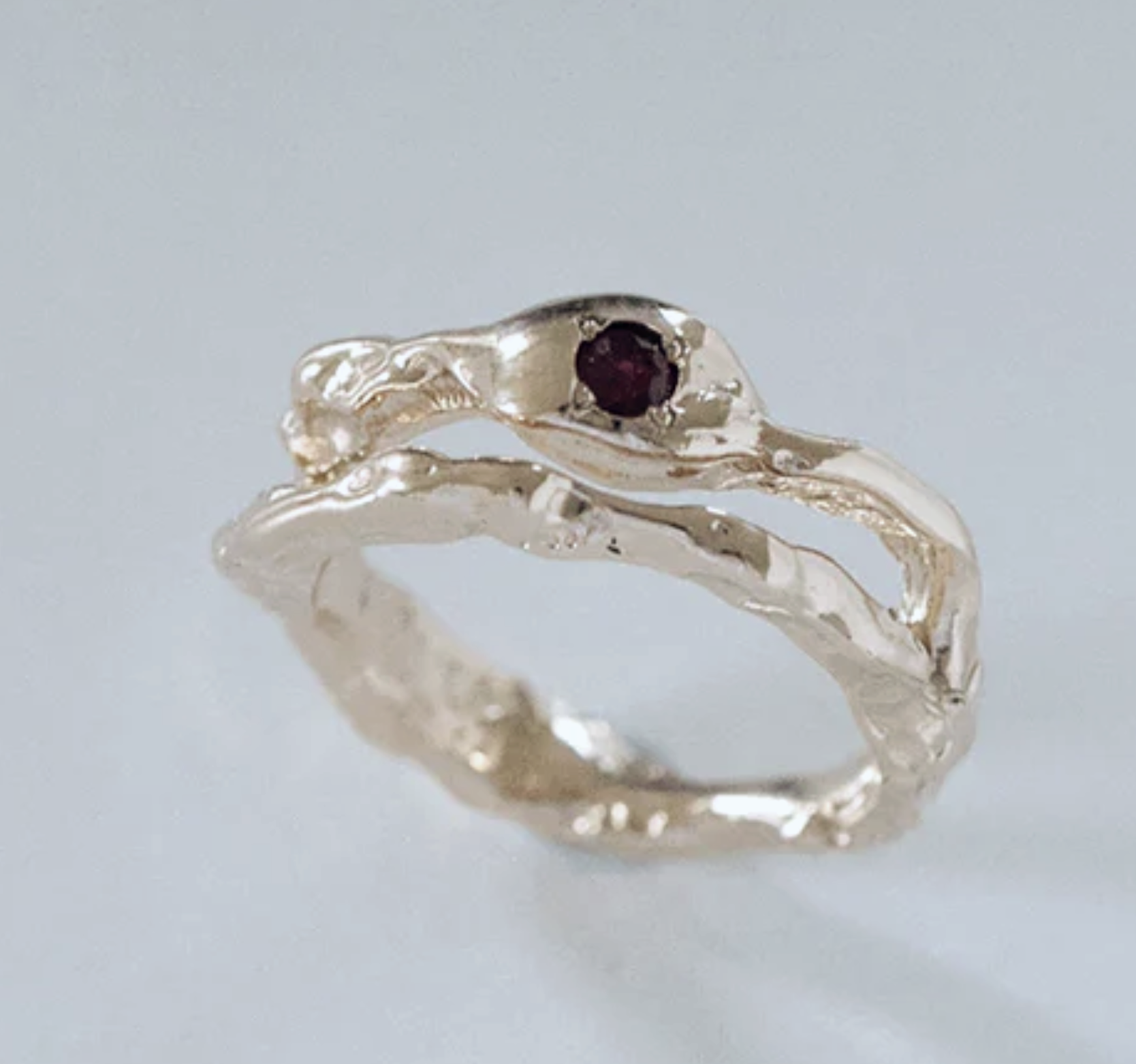 This bespoke engagement ring, cast in 18ct yellow gold, embodies the timeless devotion of two lives entwined. Its serpentine form, hand-sculpted in delicate folds, speaks to unity and the unbreakable strength of love. At its centre, a deep red garnet glows with enduring fire, its crimson hue a symbol of passion and commitment. Crafted with care, it stands as both sculpture and heirloom—an eternal celebration of love made visible.